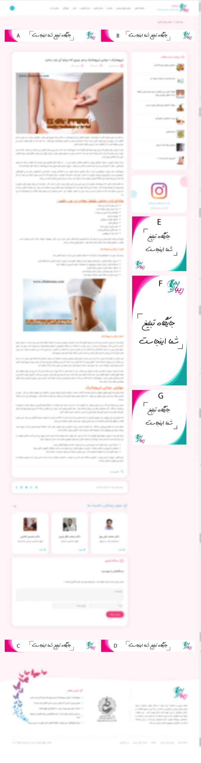 جهت نمایش بنر ها به مخاطب هدف کسب و کار شما و افزایش بازدهی ، در هر بخش سایت، بنر ها با توجه به موضوع تبلیغات شما قرار می گیرند. سایت به چهار بخش جراحی های زیبایی ، سلامت، سبک زندگی و مد و آرایشی تقسیم می شود. برای مشاهده جایگاه بنرها روی تصاویر زیر کلیک نمایید: